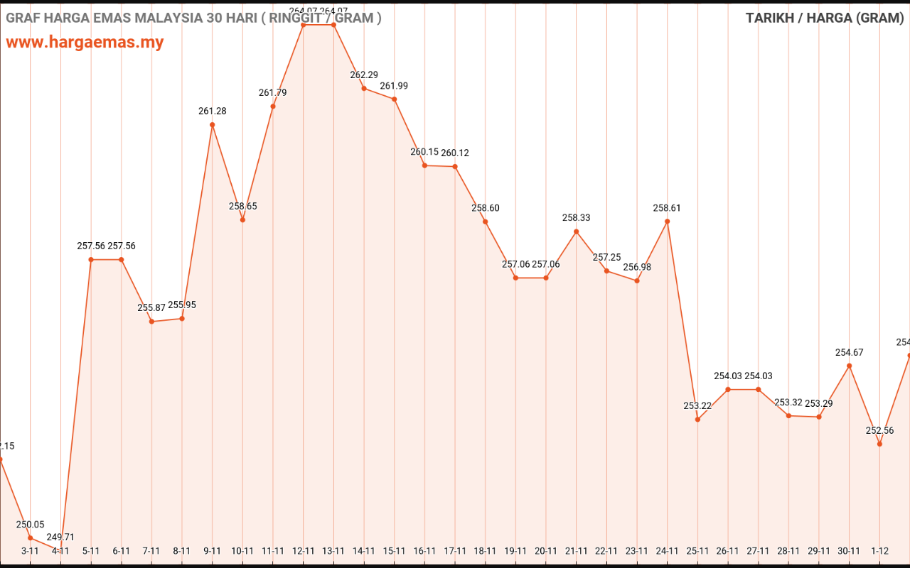 Harga emas hari ini RM252.60 per gram turun sebanyak RM-2.05 berbanding semalam RM254.65 per gram.