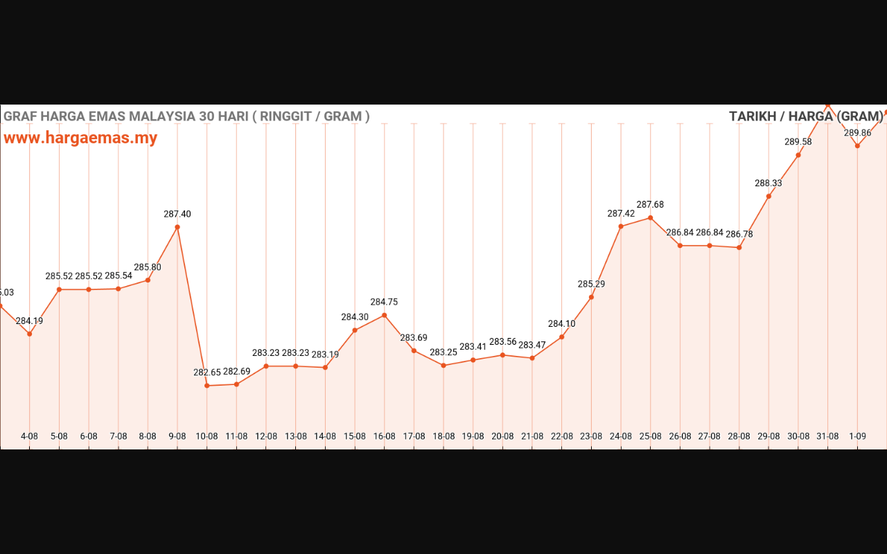Harga emas hari ini RM289.73 per gram turun sebanyak RM-1.44 berbanding semalam RM291.17 per gram.
