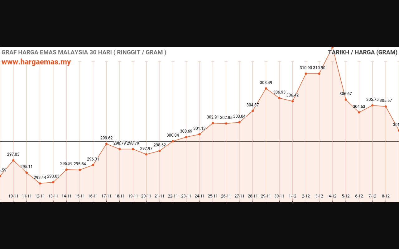 Harga emas hari ini RM301.71 per gram turun sebanyak RM-0.01 berbanding semalam RM301.72 per gram.