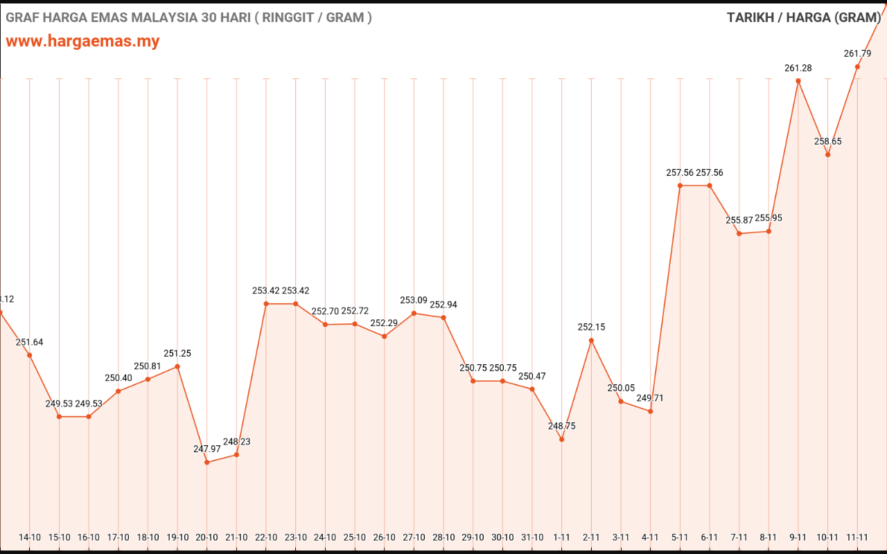 Harga emas hari ini RM261.97 per gram naik sebanyak RM3.14 berbanding semalam RM258.83 per gram.