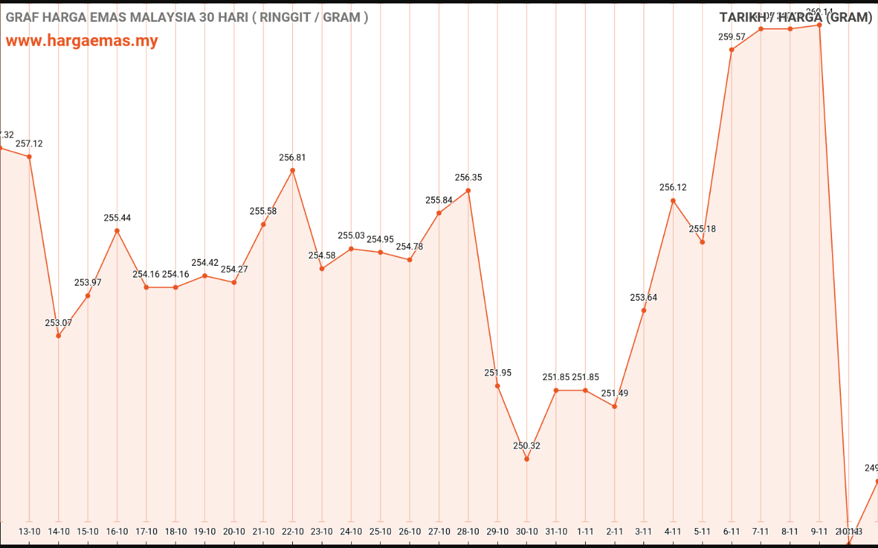Harga emas hari ini RM248.65 per gram turun sebanyak RM-1.1 berbanding semalam RM249.75 per gram.