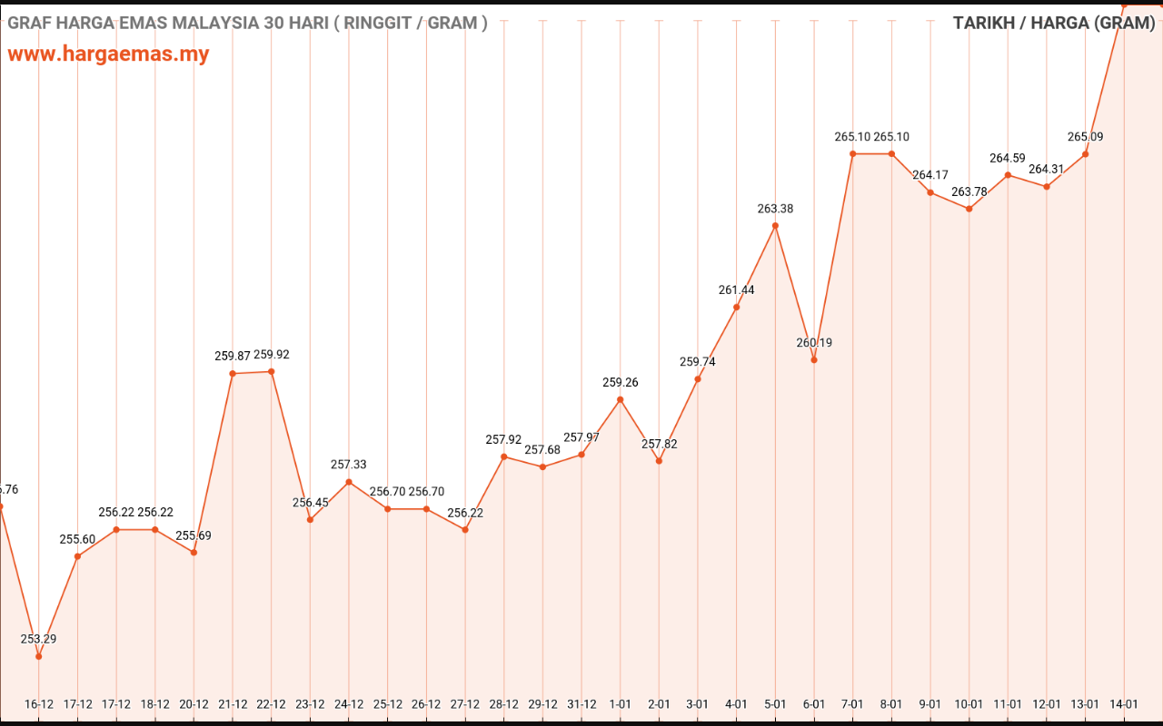 Harga emas hari ini RM265.27 per gram naik sebanyak RM0.87 berbanding semalam RM264.40 per gram.