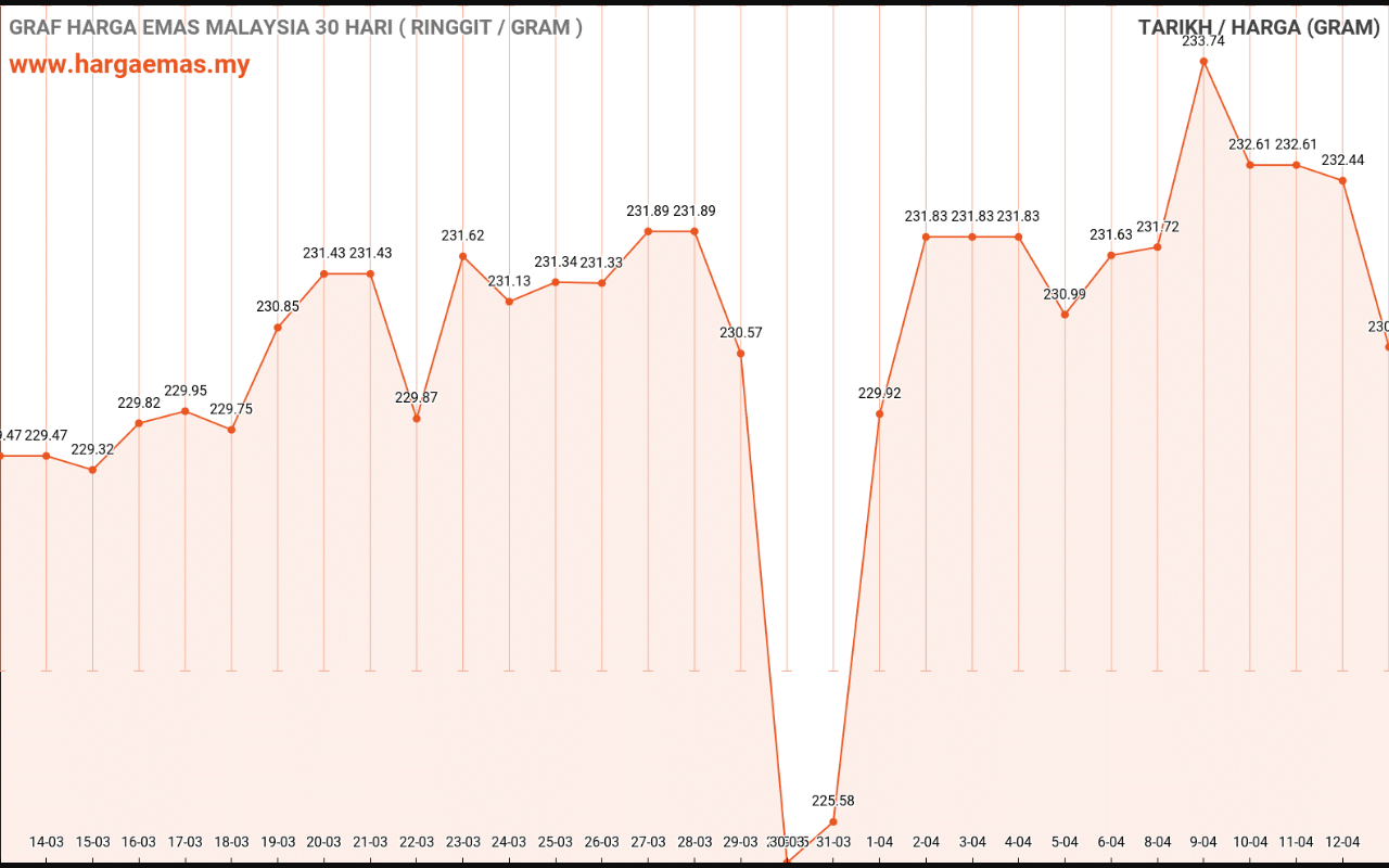 Harga emas hari ini RM232.74 per gram naik sebanyak RM1.84 berbanding semalam RM230.9 per gram.