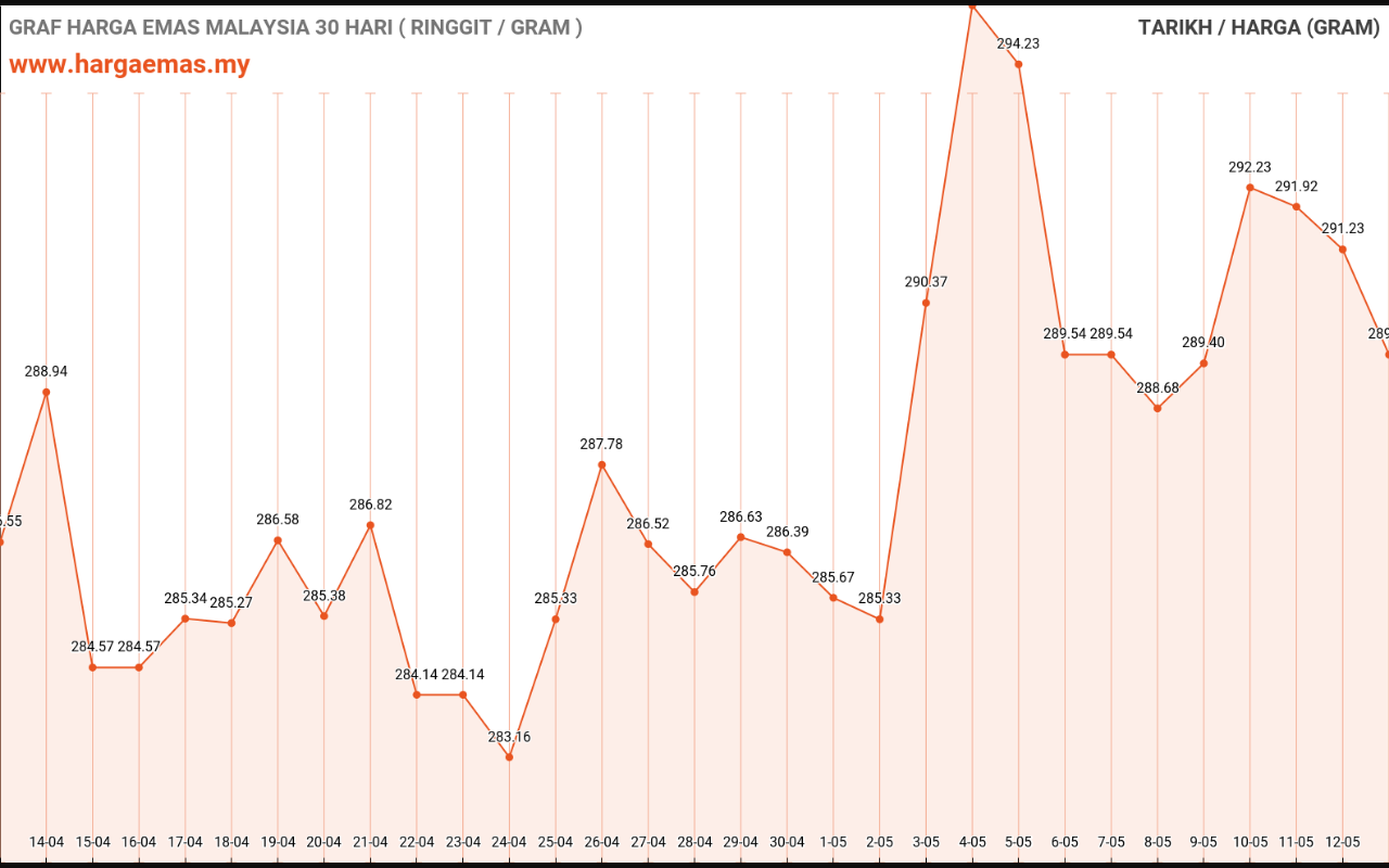 Harga emas hari ini RM290.25 per gram naik sebanyak RM0.71 berbanding semalam RM289.54 per gram.