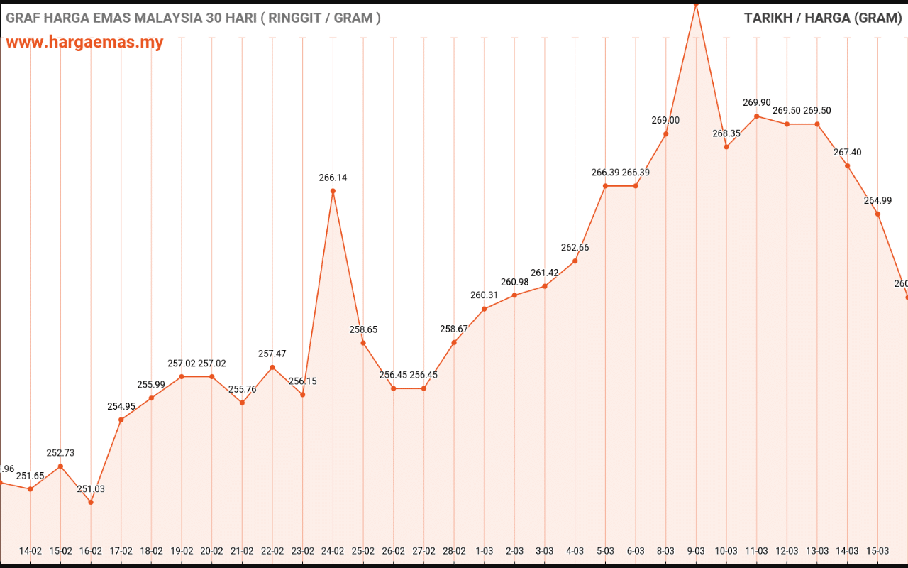 Harga emas hari ini RM264.68 per gram turun sebanyak RM-3.46 berbanding semalam RM268.14 per gram.