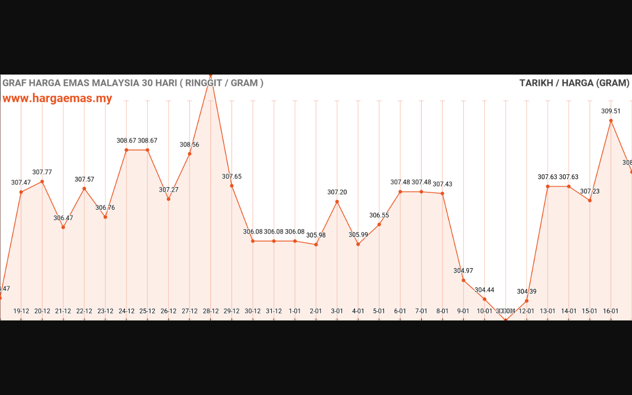 Harga emas hari ini RM310.17 per gram naik sebanyak RM2.83 berbanding semalam RM307.34 per gram.