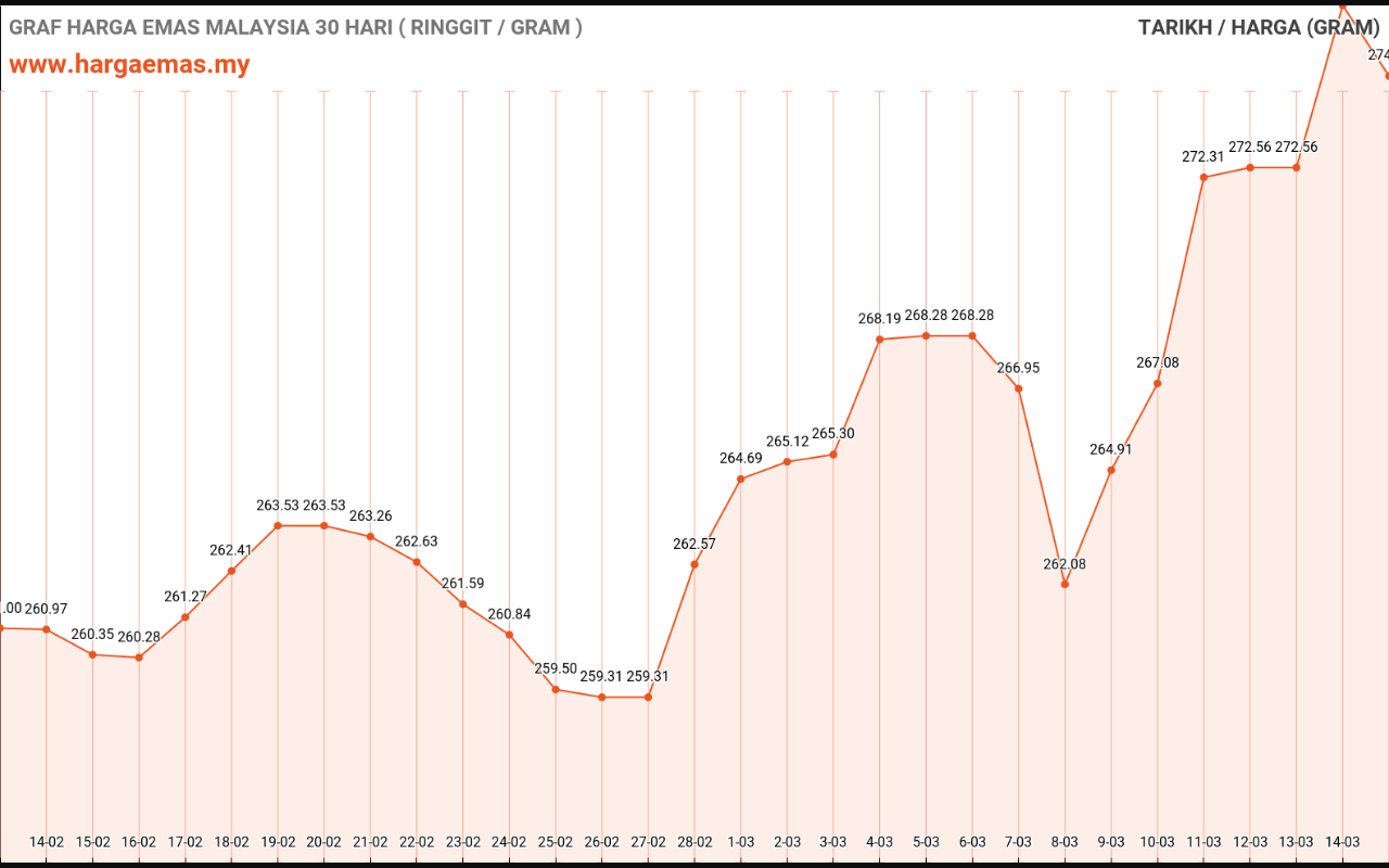 Harga emas hari ini RM278.66 per gram naik sebanyak RM3.74 berbanding semalam RM274.92 per gram.