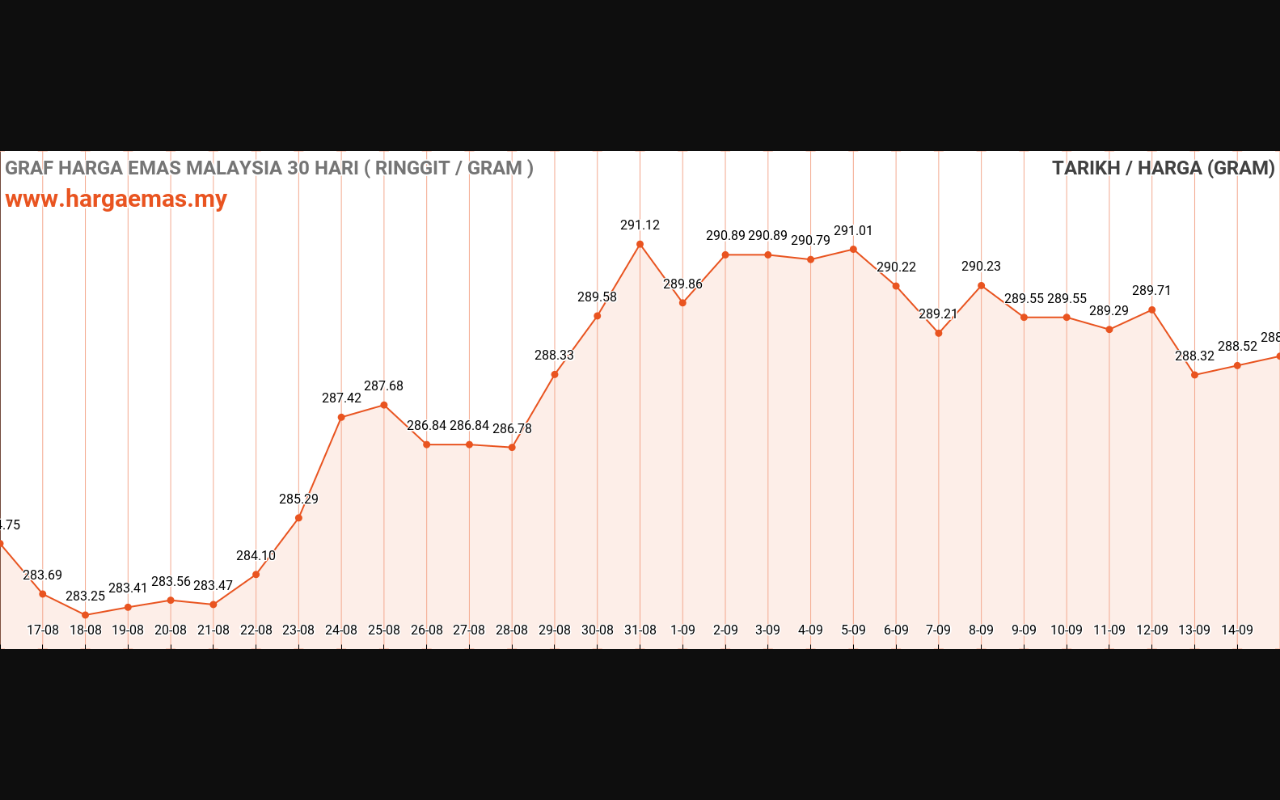 Harga emas hari ini RM290.62 per gram naik sebanyak RM1.74 berbanding semalam RM288.88 per gram.