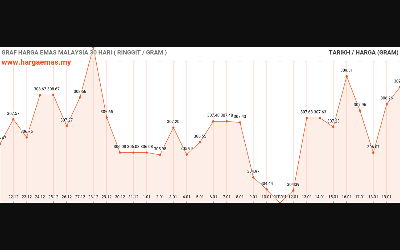Harga emas hari ini RM308.11 per gram naik sebanyak RM1.55 berbanding semalam RM306.56 per gram.