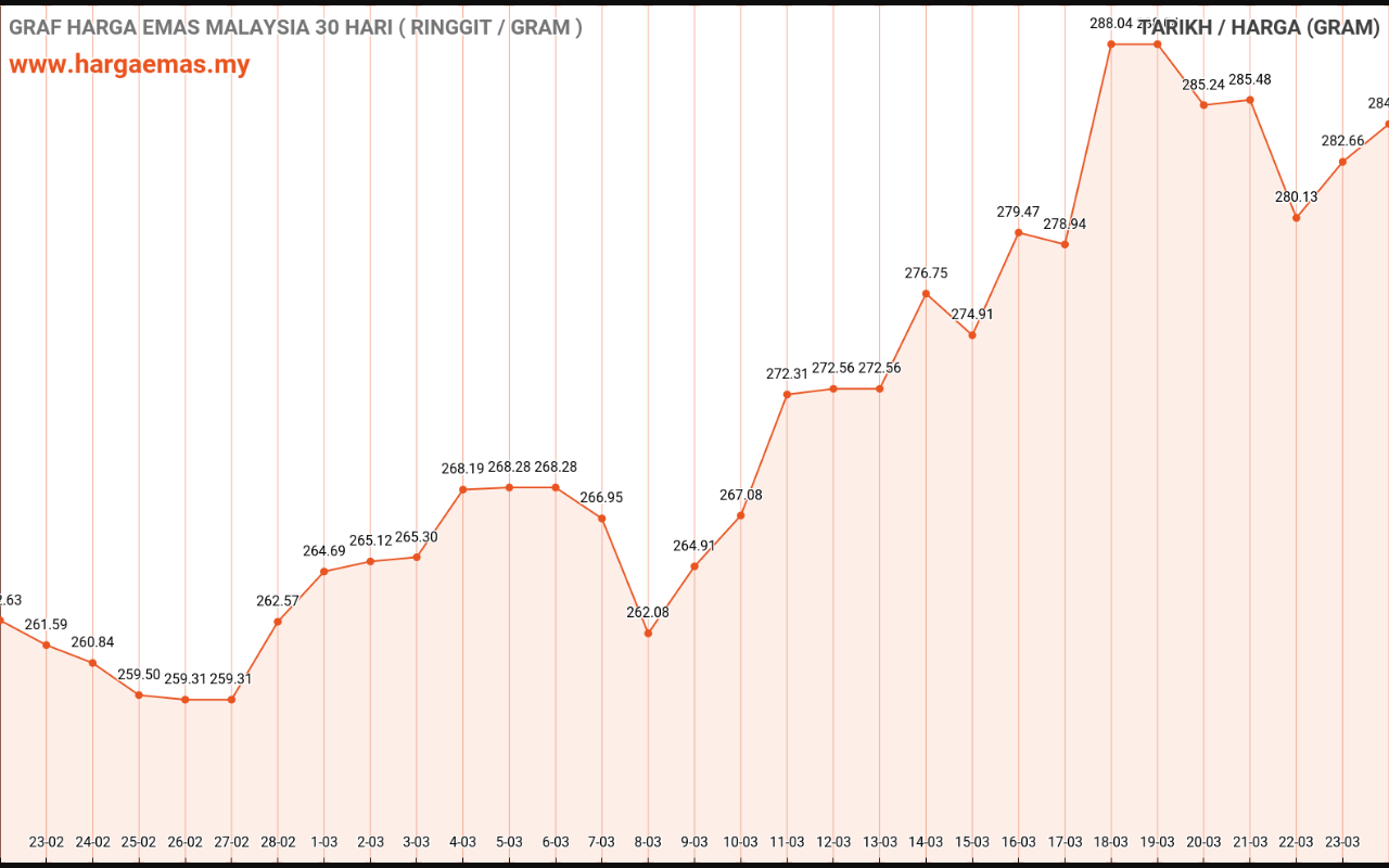 Harga emas hari ini RM282.45 per gram naik sebanyak RM2.03 berbanding semalam RM280.42 per gram.