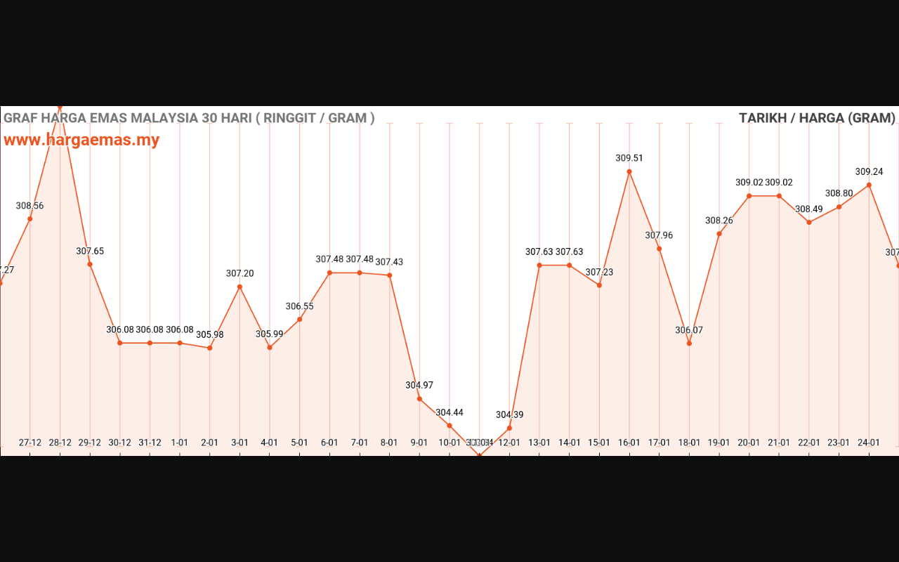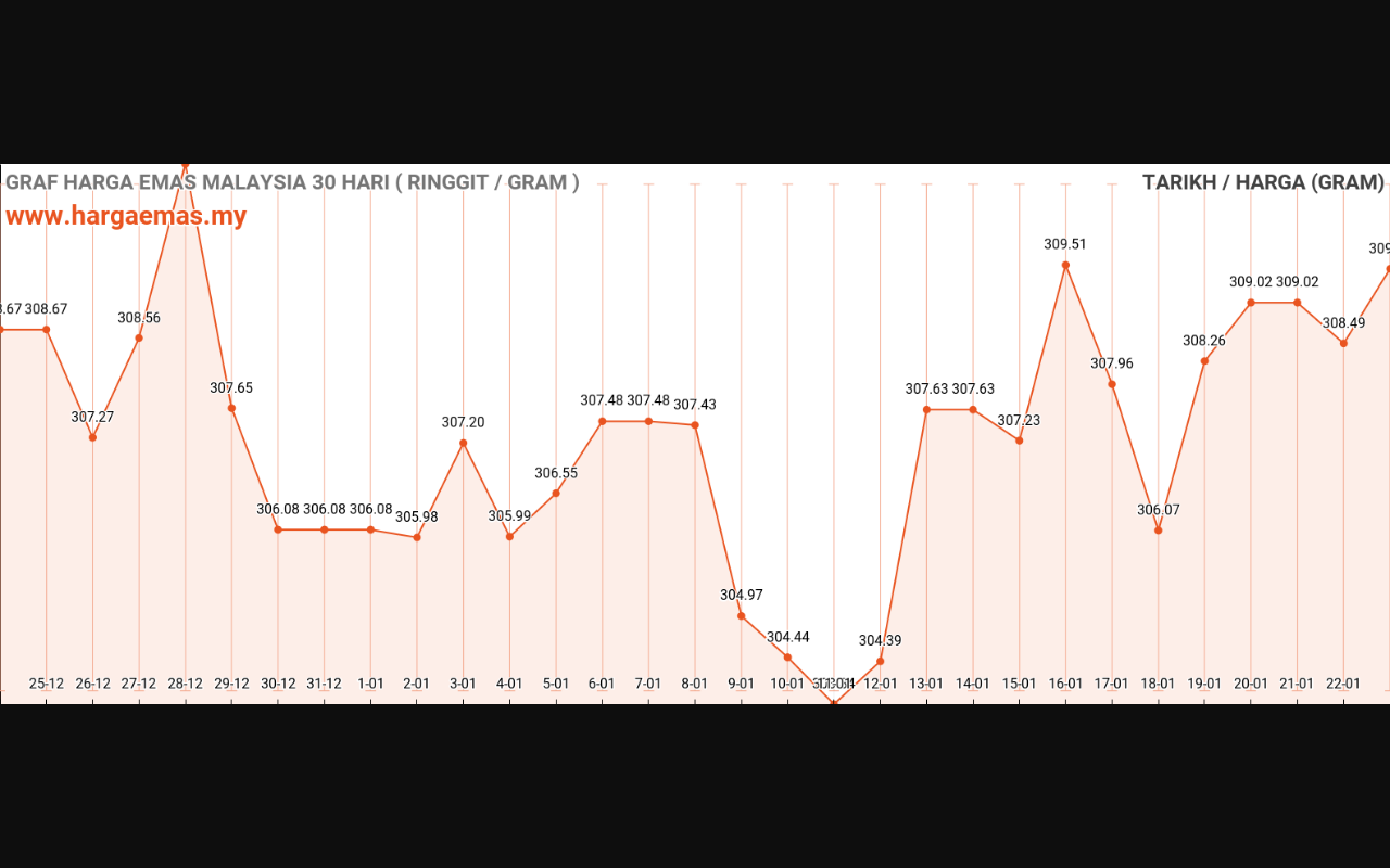 Harga emas hari ini RM309.56 per gram naik sebanyak RM0.45 berbanding semalam RM309.11 per gram.