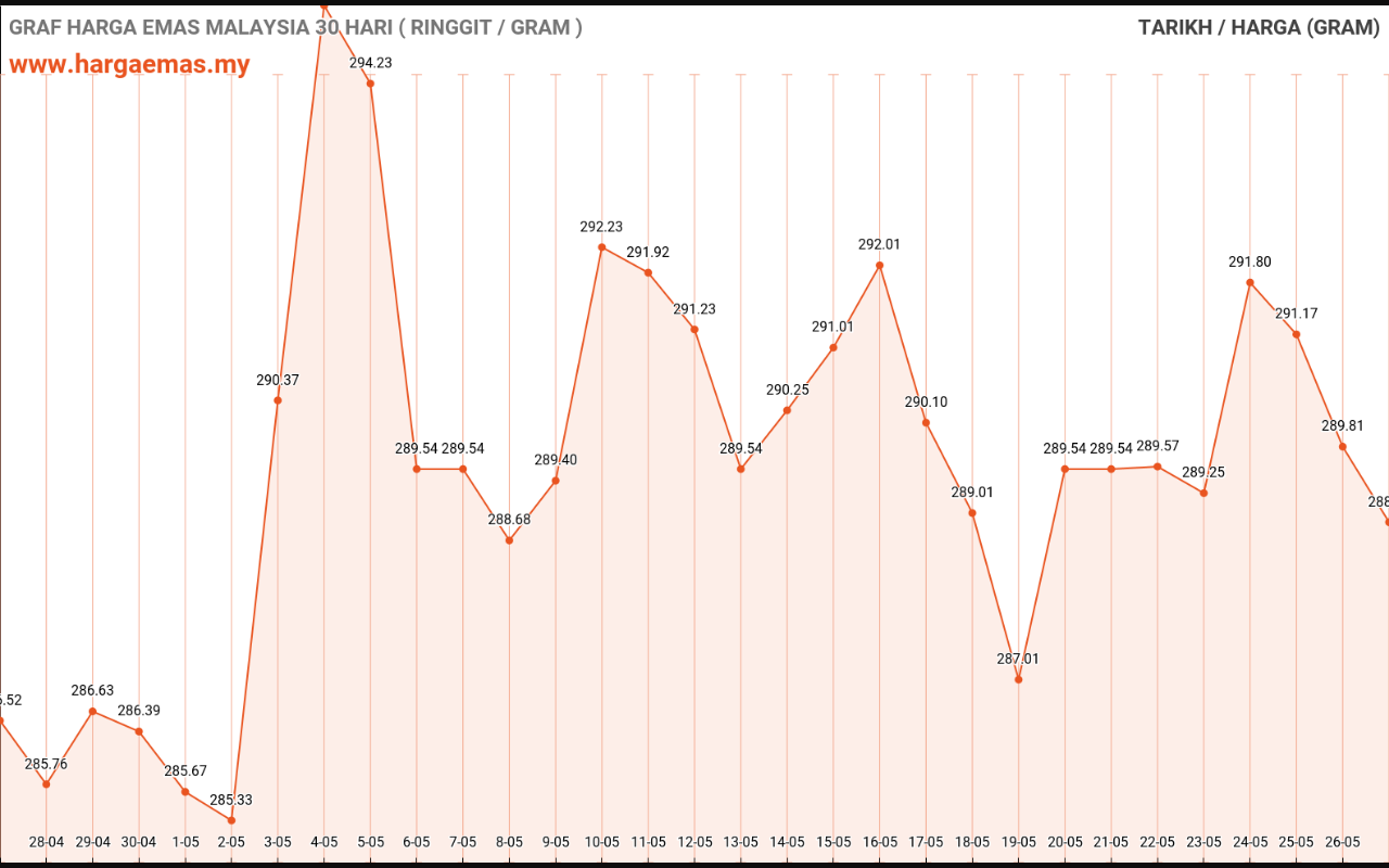 Harga emas hari ini RM289.76 per gram turun sebanyak RM-1.68 berbanding semalam RM291.44 per gram.
