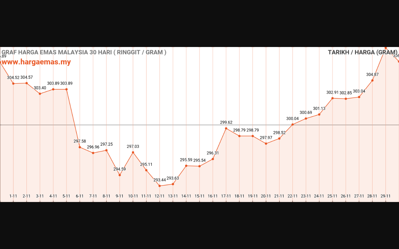 Harga emas hari ini RM309.01 per gram naik sebanyak RM4.03 berbanding semalam RM304.98 per gram.