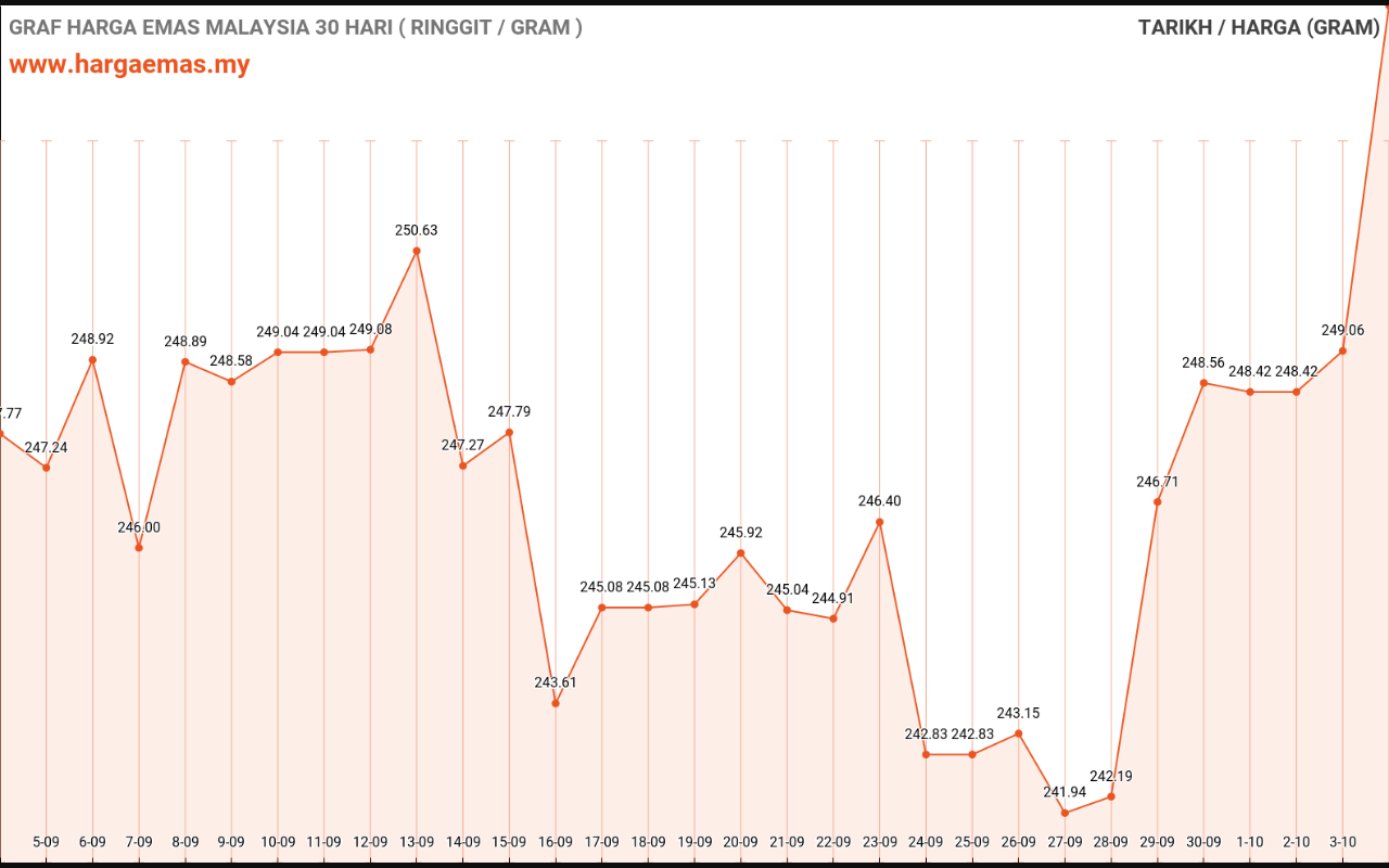 Harga emas hari ini RM249.07 per gram naik sebanyak RM0.65 berbanding semalam RM248.42 per gram.