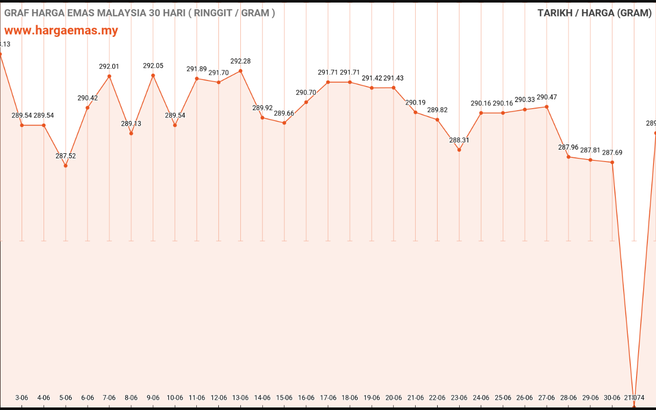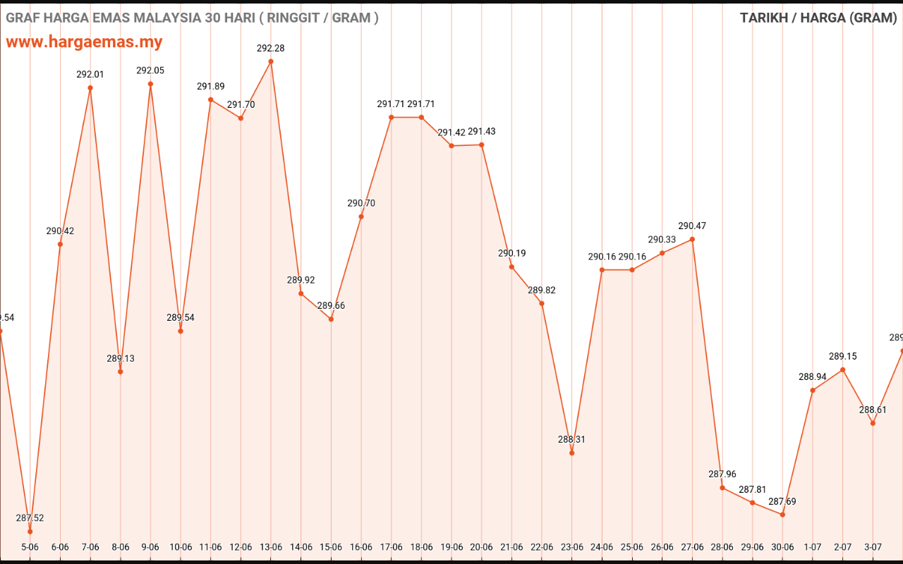 Harga emas hari ini RM288.45 per gram turun sebanyak RM-0.7 berbanding semalam RM289.15 per gram.