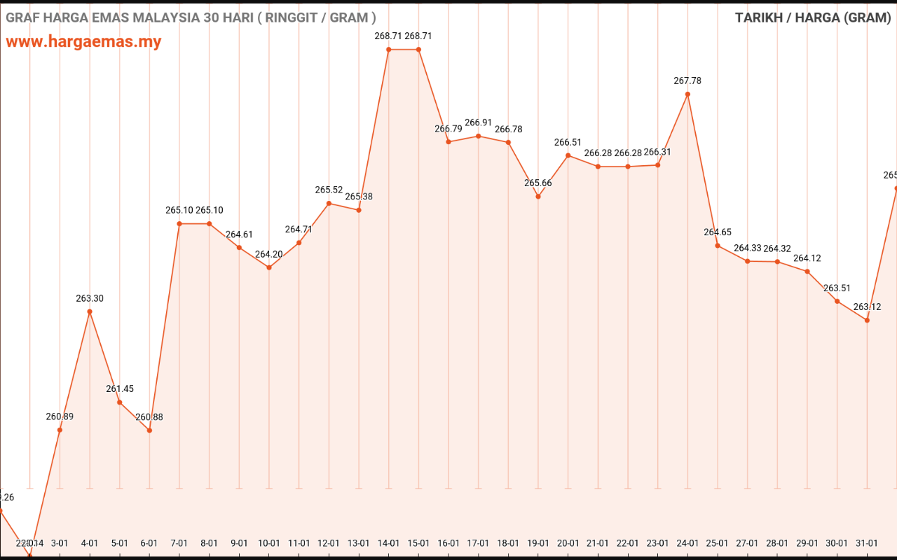 Kira DisiniHarga emas hari ini RM263.37 per gram turun sebanyak RM-0.05 berbanding semalam RM263.42 per gram.