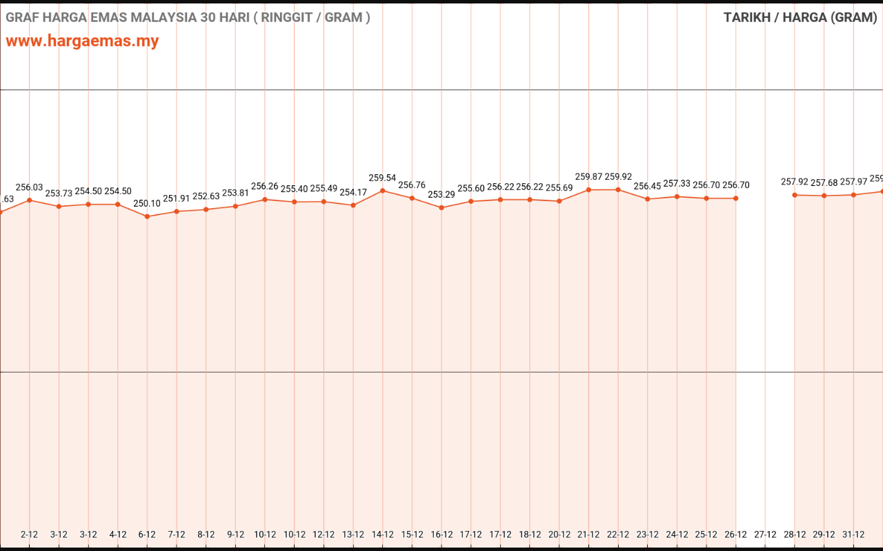 Harga emas hari ini RM259.26 per gram naik sebanyak RM0.63 berbanding semalam RM258.63 per gram.