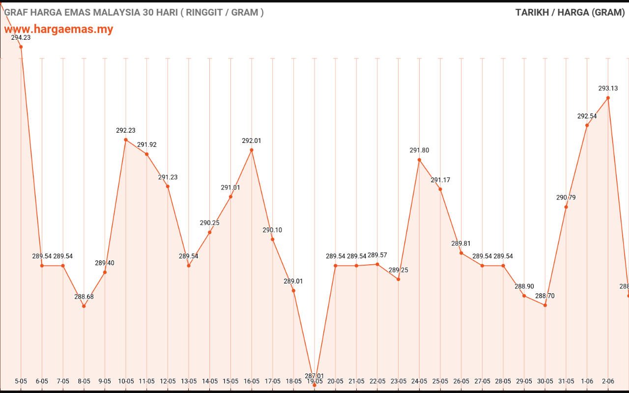 Harga emas hari ini RM289.54 per gram tidak berubah sebanyak RM0 berbanding semalam RM289.54 per gram.