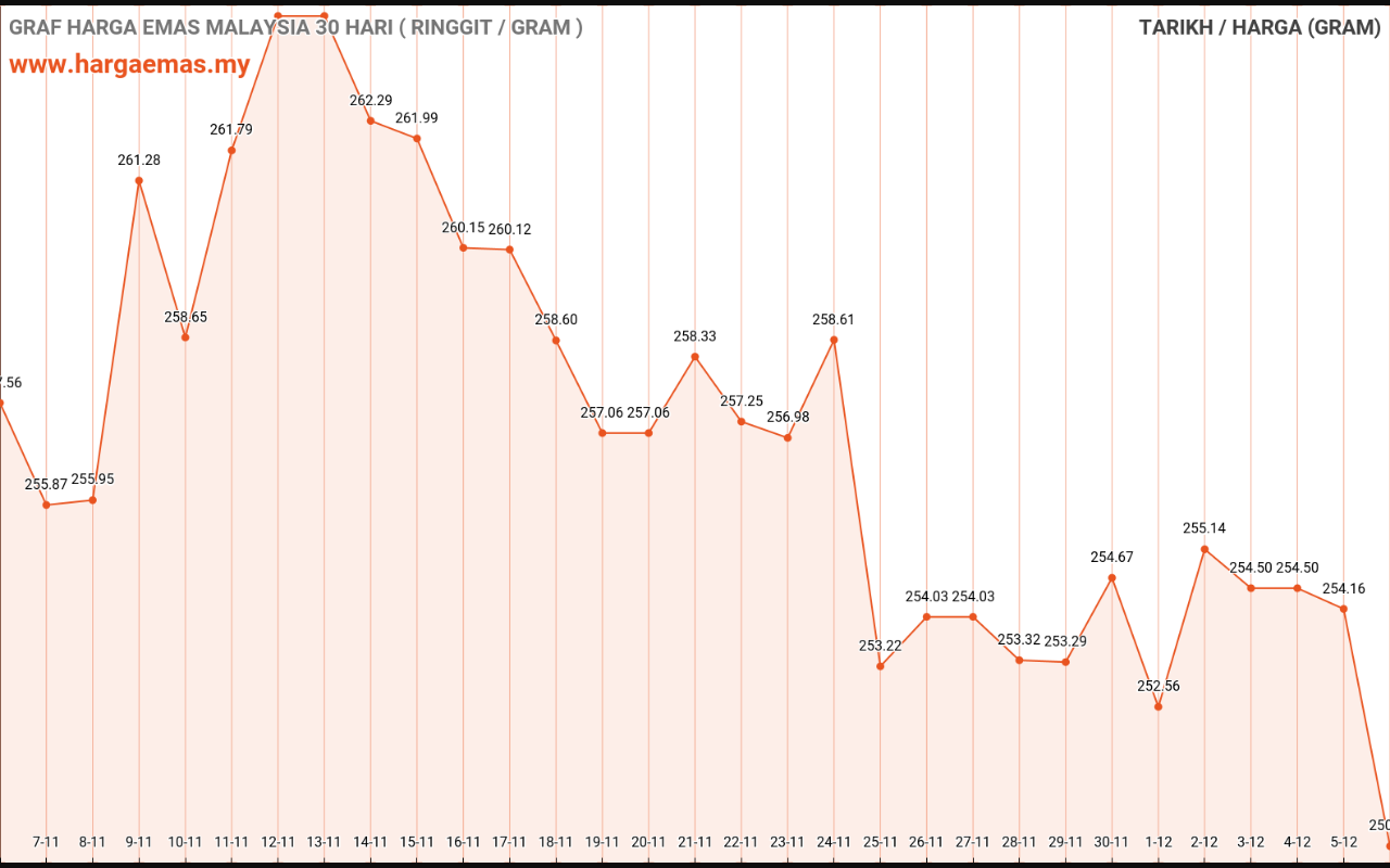 Harga emas hari ini RM250.99 per gram naik sebanyak RM0.84 berbanding semalam RM250.15 per gram.