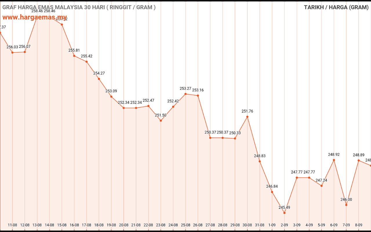 Harga emas hari ini RM248.98 per gram naik sebanyak RM2.95 berbanding semalam RM246.03 per gram.