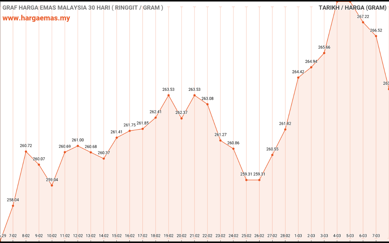 Harga emas hari ini RM264.98 per gram naik sebanyak RM1.07 berbanding semalam RM263.91 per gram.