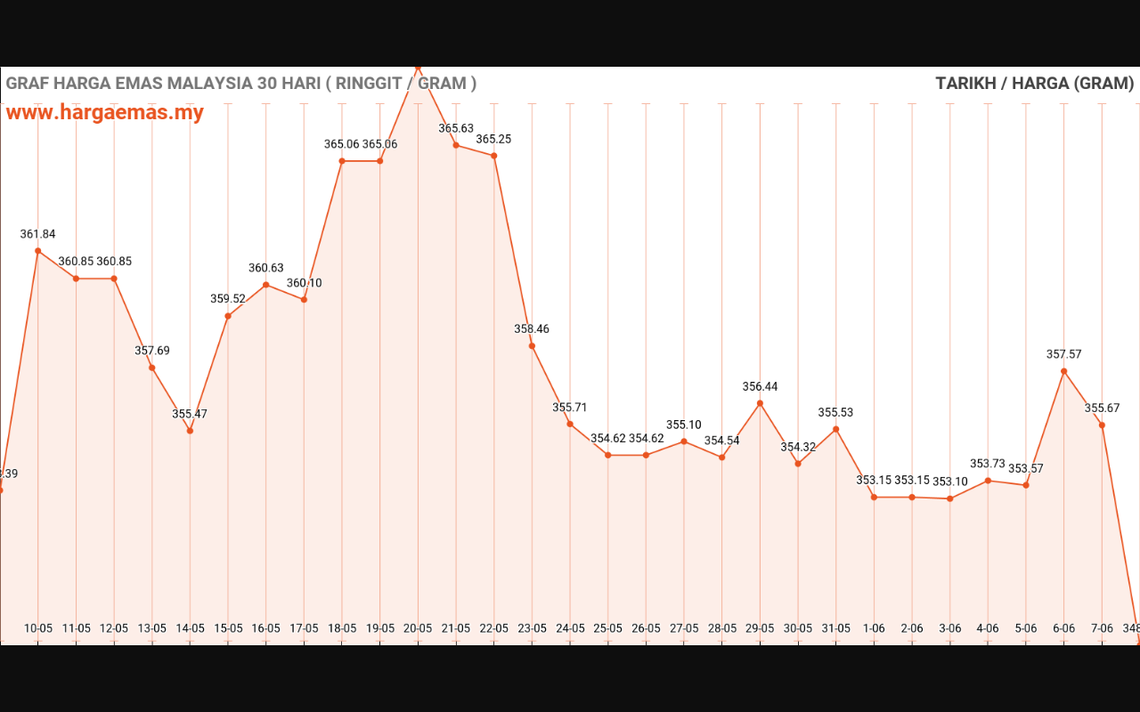 Harga emas hari ini RM348.03 per gram tidak berubah sebanyak RM0 berbanding semalam RM348.03 per gram.
